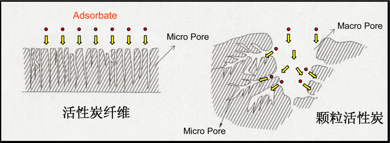 活性炭纖維是一種表面納米粒子,具有不規(guī)則的結(jié)構(gòu)與納米空間混合的體系。其纖維直徑細(xì),與被吸附物的接觸面積大,且可以均勻接觸與吸附,使吸附材料得以充分利用。效率高,且具有纖維、氈、布和紙等各種纖細(xì)的表態(tài),孔隙直接開口在纖維表面,其吸附質(zhì)到達(dá)吸附位的擴(kuò)散路徑短,且本身的外表面積較內(nèi)表面積高出兩個(gè)數(shù)量級。