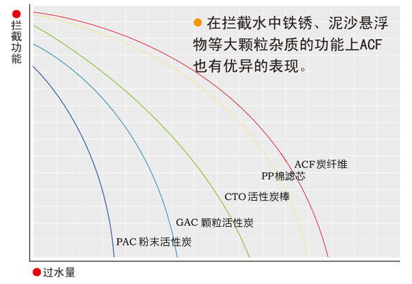 ACF(炭纖維)優(yōu)異的凈水功能來源于其微孔直接開口于纖維表面,當(dāng)水流經(jīng)ACF濾芯時(shí)水中污染物會被微孔均勻、快速地吸附;直徑纖細(xì)的纖維狀的形態(tài),使ACF凈水器對水濾阻降至極小,在保證壓力損失最小的情況下,讓水與材料充分接觸得以最大利用;實(shí)驗(yàn)表明,ACF對水中污染物的去除能力是粒狀活性炭的10~100倍,同時(shí)增加了ACF濾芯的使用壽命,減少更換成本。